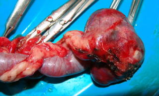 症例: 中型犬 8歳 腹部が膨れてきたとのこと来院。レントゲン2枚(5000円 )エコー(2500円)で脾臓の腫瘍と確認 。手術を選択